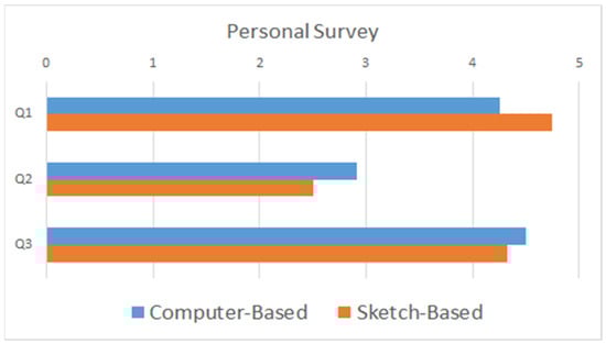 The usability of the sketch-based environmental authoring tool was confirmed by Q1, as shown in Figure 15. Usability refers to the ease of use of tools. In Q1, the average sketch-based score was high. Users answered that the sketch-based environment authoring tool could place a 3D object at a more specific desired location than a 2D screen-based environment authoring tool. In the case of the pairs in their 50s, although GUI was simple (so as cannot affect to experiment) and they could handle the mouse, they complained of unfamiliarity in using the mouse interface and did not want to do so if they could. Thus, it was confirmed that sketch-based environmental authoring tools are easier to use than 2D screen-based tools.