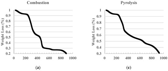The biomass pyrolysis results were presented in the same way as for combustion (Figure 1c,d). Unlike the case of combustion, the decomposition stages were not very abrupt. First, as the temperature increased, a drying process took place and, possibly, the release of some volatile compounds. From 250 °C onwards, the low molecular weight compounds began to volatilise, up to about 350 °C. The remaining mass fraction of the gas was then released. The rest of the mass fraction corresponded to ash and solid carbonaceous residues that were not oxidised by the atmospheric conditions under which the decomposition took place. The differential thermogravimetry revealed two other peaks: one at 273 °C, corresponding to the decomposition of hemicellulose, and the other at 319 °C, corresponding to the thermal decomposition of cellulose. Lignin decomposition was difficult to identify as it decomposes over a wide range of temperatures. The 660 °C peaks may have corresponded to the decomposition of this compound.