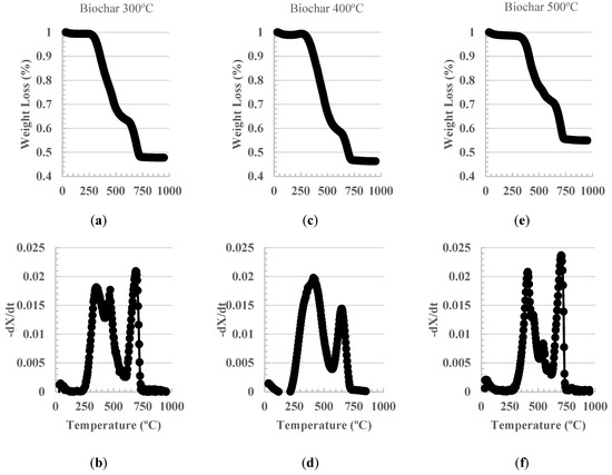 Finally, the results obtained from the thermogravimetric analysis of the different biochars produced at 300, 400, and 500 °C are presented (Figure 2). As the biochar comes from a plant (Posidonia oceanica) pyrolysis, the decomposition of three main components was expected: hemicellulose, which has a decomposition temperature between 220 and 315 °C; cellulose, whose decomposition occurs from 315 °C and up to about 400 °C; and, finally, lignin, whose decomposition is somewhat more difficult, in some cases requiring maximum temperatures of 900 °C to decompose [56]. As presumed, three peaks of matter decomposition were observed in the first biochar (300 °C) and in the third (500 °C). These peaks occurred at the expected temperature ranges, corresponding to the decomposition of hemicellulose, cellulose, and lignin. However, only two peaks were observed in the results obtained for the biochar produced at 400 °C (Figure 2c,d). They corresponded to cellulose (435 °C) and lignin (663 °C) decomposition. It was not possible to observe the cellulose decomposition as it is likely to have taken place during the production of the biochar.