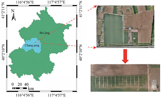 The study was conducted in the Chang Ping District, Beijing (Figure 1). The base is flat and fertile. The mass fractions of nitrate nitrogen, quickly available potassium, and available phosphorus in 0–0.3 m soil layer of the experimental field were 3.16–14.82, 86.83–120.62, and 3.14–21.18 mg·kg−1, respectively. The soil organic matter content was 15.8–20.0 g·kg−1. Its average elevation is approximately 36 m, and the soil type is tidal soil. The average annual temperature is approximately 13 °C. The average annual rainfall is approximately 510 mm. In order to increase the difference in crop nitrogen content in each experimental plot, the study was carried out by using two types of wheat: Zhong Mai 175 and the Jing 9843 type. Four different nitrogen levels were set up for nitrogen treatment: N1: 0 kg·hm−2; N2: 195 kg·hm−2; N3: 390 kg·hm−2; and N4: 585 kg·hm−2. The nitrogen fertilizer was urea. Base and elongation fertilizers were applied to the soil at 1/2 of the total amount of fertilizer applied. Wheat planting was undertaken on 29 September 2017. The size of each experimental plot was 1.2 × 1.5 m, with 16 plots and 3 replications, totaling 48 plots.