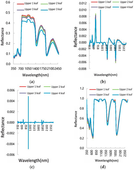 There are differences in the original spectral reflectance of leaves at different leaf positions. The spectral reflectance of leaves increased with the increased number of leaf positions, and was obviously different between 750–1300 nm and 1400–1900 nm. In other band ranges, the spectral reflectance of leaves at different positions was similar. The reflectivity of FD of leaves at different leaf positions showed no difference, and there was a clear reflection peak near 743 nm. There was no difference in reflectivity of SD of leaves at different leaf positions. The SD fluctuated in the range of 550–1000 nm and 1700–1950 nm, with the maximum value near 940 nm. There was no difference in reflectance of the CR spectrum of different leaf positions; the reflectance was peaked in the visible–near infrared region of 750–1300 nm.