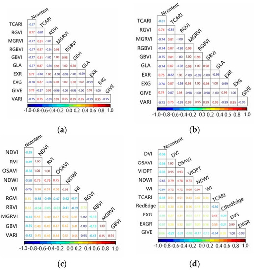 The correlation analysis between vegetation indices constructed in Table 1 and leaf nitrogen content at different leaf positions was carried out, and the correlation coefficient matrices were drawn. The results are shown in Figure 3.