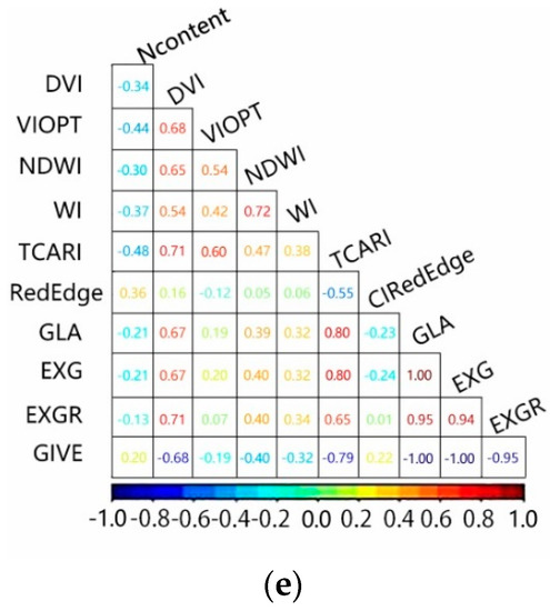Correlation matrix between vegetation indices and leaf nitrogen content for different leaf positions. (a) Flag leaf; (b) upper 1 leaf; (c) upper 2 leaf; (d) upper 3 leaf; (e) upper 4 leaf.