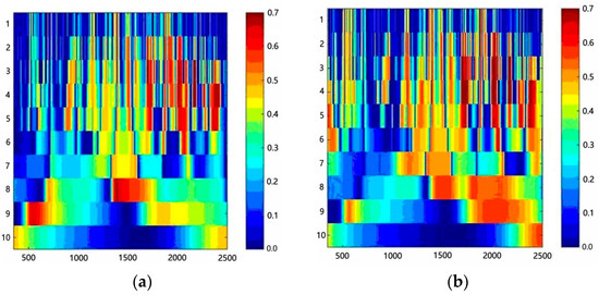 where is the spectral reflectance, is the spectral band in the range of 350–2500 nm, is the wavelet basis function, a is the scale factor, and b is the translation factor. In this study, a Meyer function with fast convergence speed was selected as the wavelet basis function, and CWT was performed based on MATLAB software (MATLAB 2021, MathWorks Company, Natick, MA, USA). In order to reduce the redundancy of data, the scale of the continuous wavelet transform was decomposed into 21, 22, 23, …, 210, corresponding to scale 1, 2, 3, …, 10.