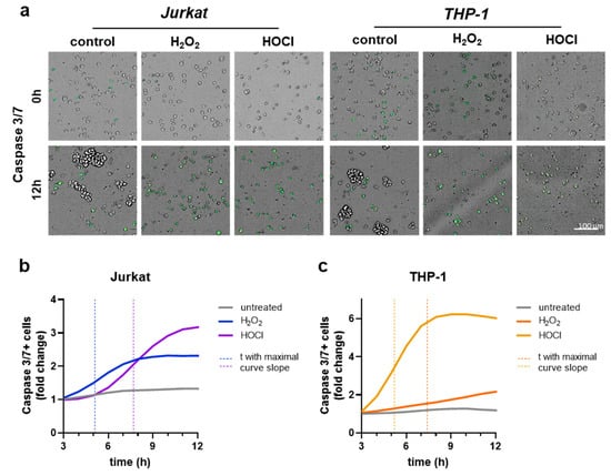 Live-cell imaging of apoptosis initiation was performed in Jurkat and THP-1 cells in a time course measurement over 12 h after treatment with respective IC20-inducing concentrations of H2O2 or HOCl in 96-well plates. To identify apoptotic cells, CellEvent caspase 3/7 detection reagent (ThermoFisher, Dreieich, Germany) was added to the wells 2 h after oxidant exposure. The plate was then placed in a high-content imaging device (Operetta CLS; PerkinElmer, Rodgau, Germany) pre-heated to 37 °C and set to 5% CO2 to provide optimal cultivation conditions for the cells during the measurement period. Images were acquired hourly with a 20× (NA: 0.4) air objective (Zeiss, Jena, Germany) using brightfield channel, digital phase contrast, and the λex 475 nm λem 525 ± 25 nm channel to detect activated caspases 3/7 via fluorescence of a DNA-binding dye. Image analysis was performed using the software Harmony 4.9 (PerkinElmer, Germany).