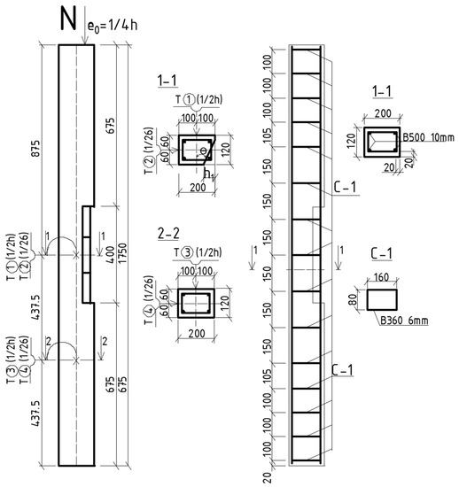 The design for the prototypes of medium flexibility (h = 1750 mm) is shown in Figure 1. Samples of low (h = 1000 mm) and high flexibility (h = 2500 mm) had the appropriate heights with the same reinforcement and length of the damage zone (400 mm was the zone for each tested reinforced concrete element).
