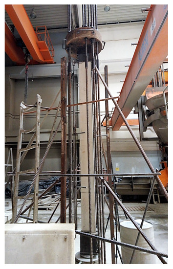 The testing of reinforced concrete elements was performed in a specially designed test facility. The load was created with a hydraulic press located on the lower metal plate of a cage (Figure 2). The force on the column was transmitted through metal plates placed at both ends of the test model in half of the cross-sectional area (h/2 × b). Thus, the application of the eccentric load was achieved by inserting 120 × 100 × 10 mm metal plates on the bottom of metal caps on half of the cross-section, where the indentation of the experimental models occurred.