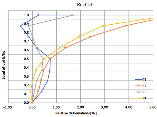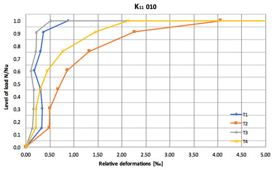 Below are graphs of the characteristic deformations of columns in the first (Figure 4), second (Figure 5), and third (Figure 6) groups of experimental samples.