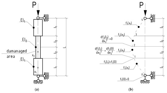 In Formula (1), ; ; , is the stiffness of the undamaged and damaged parts of the columns; P is the compressive force; , is the deflection function for the corresponding section; and , are the corresponding coordinates of the points.