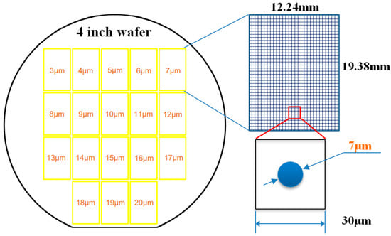In order to study strain relaxation of InGaN/GaN MQWs, the top p-GaN layer thickness was reduced to 100 nm by inductively coupled plasma (ICP) etching. Then, we divided a 4-inch wafer into 18 areas of the same size with area sizes of 12.24 mm × 19.38 mm. We etched an equal number of micro-pillars of different sizes in each area and the etching period was 30 μm (row: 12,240 μm /30 μm = 408, column: 19,380 μm/30 μm = 646). The diameters of the etched micro-pillars ranged from 3 μm to 20 μm. (as shown in Figure 2)
