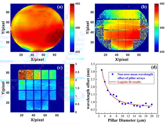 The wavelength distribution inhomogeneity caused by the original wafer epitaxy affects the extraction of micro-pillar PL information. In order to suppress these influences, we subtracted the AFT PL from the ORI PL and filtered the peak wavelength information out of the micro-LED pillar area. Then, some abnormal values far from the average in the ORI minus AFT PL results caused by etching damage and wafer boundary epitaxy quality degradation are filtered based on the Chauvenet-criterion method [14]. The result is shown in Figure 3c and we can obtain the peak wavelength blueshift caused by the micro-LED pillar arrays. There is a wavelength shift of nearly 0–3 nm in the regions of different micro-column sizes. It can be concluded that the smaller the column size, the greater the wavelength blueshift.