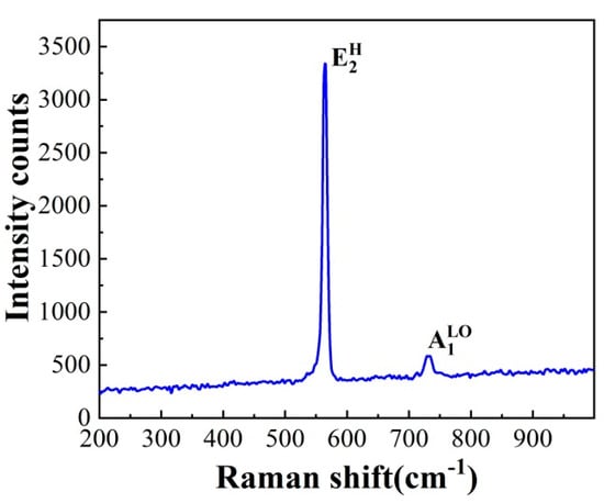 In order to verify the above micro-pillar arrays’ strain-related PL results, confocal Raman microscopy measurements were employed to characterize micro-pillar strain relaxation. Figure 4 shows the InGaN/GaN wafer Raman spectra collected in the geometric configuration of Z(X,X). There are distinct peaks at approximately 567 cm−1 and 734 cm−1, which are assigned to the E2H and A1LO modes of wurtzite GaN, respectively. The Raman E2H mode shift can provide strain relief information due to the biaxial stress caused by lattice mismatch between GaN and InGaN [15,16].