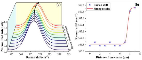 The peak of the E2H mode at a different distance from the center was collected in Figure 5b and the movement of the E2H peak position could be observed in more detail. As the distance from the center of the micro-pillar increases, the frequency of the Raman peak remains relatively stable near 566.82 cm−1 until a distance ≥ 8 μm, when the Raman frequency shift starts to move significantly towards the high-frequency direction. At the boundary position, the frequency shift reaches 567.93 cm−1, which is close to the bulk GaN E2H mode. The change of E2H indicates that there is strain inside the pillar, while there is full strain relaxation at the edge.