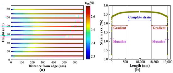 The FEM calculated strain distribution of 12 In0.25Ga0.75N quantum wells is shown in Figure 6a. The height marks the vertical position of the quantum wells in the micro-LED pillar. At the transverse inside of the quantum well (distance from edge > ~600 nm), the in-plane strain (εxx = εyy) of InGaN is about 2.67%, which is the complete strain of In0.25Ga0.75N on GaN. The strain decreases as the boundary approaches. The strain εxx is about 2.3% near the edge of pillar and the edge strain is too small to represent using a color scale. Therefore, the exact strain distribution is listed in Figure 6b.