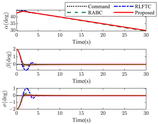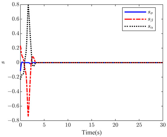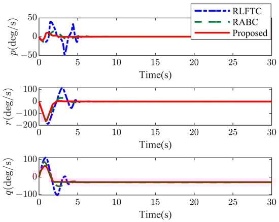 The tracking performances of the attitude angles under three controllers are shown in Figure 2, Figure 3, Figure 4 and Figure 5. It can clearly be seen that the proposed control scheme can provide faster convergence and smaller overshoot in the presence of parametric uncertainties and external disturbances. The angular rates of RLV and the sliding manifolds are demonstrated in Figure 6 and Figure 7, which provide further evidence for the improved performance of the proposed control scheme. Moreover, by comparing the tracking performance with the control inputs illustrated in Figure 8, it can be observed that the proposed control scheme exhibits better transient and steady-state performance with limited control inputs. The evolution trajectories of and are depicted in Figure 9 and Figure 10, respectively. It can be readily found that and are convergent to the same values, which indicates that the ideal weight vector can be effectively estimated via the proposed adaptation law.