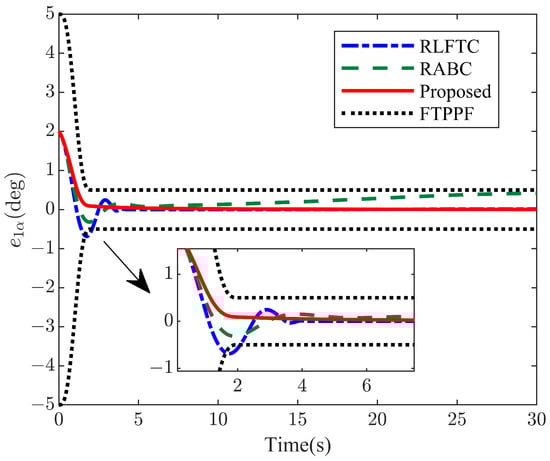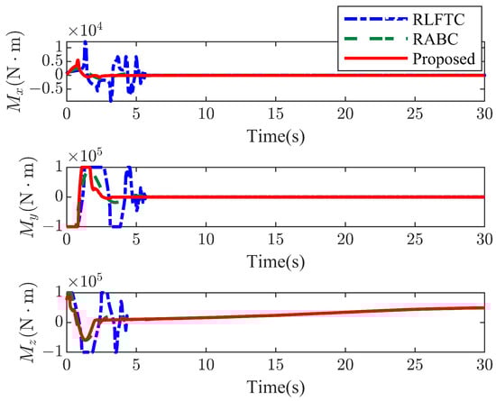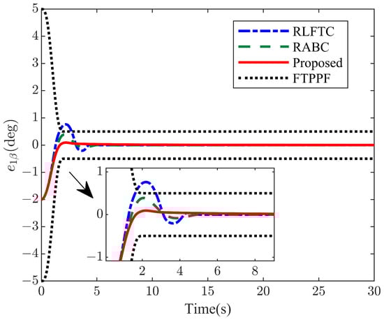 Furthermore, in order to demonstrate the superiority of the proposed control scheme, the RL-based finite-time control (RLFTC) with input constraints in [17], and the robust adaptive backstepping control (RABC) method in [33], are implemented. To provide a fair comparison, the time-fuel performance index of the RLFTC is identical to the proposed method, and the generation method for the initial values of the actor network and the critic network remains the same. The other user-defined parameters of the RLFTC are intensively selected as . The parameters of the RABC remain the same as that in [33]. The simulation results are given in Figure 2, Figure 3, Figure 4, Figure 5, Figure 6, Figure 7, Figure 8, Figure 9 and Figure 10.