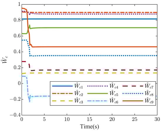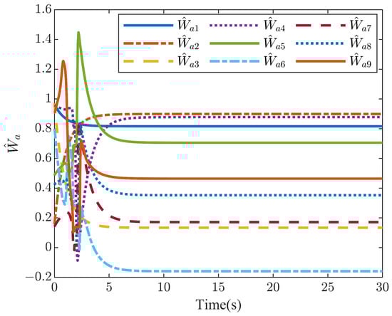 The initial values of and are randomly generated in . The user-defined parameters of the weight adaptation laws are designed as .