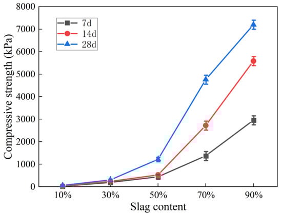 The variations in the UCS of the stabilized soil with the curing age after the addition of different proportions of blast furnace slag are shown in Figure 1. It can be seen that the strength of the geopolymer-stabilized soil gradually increased with age. When the slag content was increased from 10% to 50%, the UCS of the geopolymer solidified soil increased slightly. When the content was 50%, the strength of the solidified soil cured for 28 d was 1.53 MPa. When the slag content was increased from 50% to 90%, the UCS of the stabilized soil increased dramatically, reaching 7.20 MPa at 90%. This shows that the excitation effect of the alkali activator on slag was significantly stronger than that of the FA, and the excitation of the slag played a major role in the increase in the strength of the stabilized soil specimens [27]. The reason for this is that the slag contained more vitreous than the FA, and the SiO44− in the vitreous was easily depolymerized and hydrated by the other substances under the alkaline environment. In addition, the CaO content of the slag was several times higher than that of the FA. The Si and Al ions polymerized with Ca2+ and formed a large number of overlapping gel products, which were beneficial to the strength development of the stabilized soil [28].