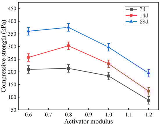 The alkali activator modulus is the molar ratio of SiO2 to Na2O, and it is one of the important parameters of a geopolymer alkali activator. Figure 2 shows the variations in the UCS of the geopolymer-stabilized soil when the modulus of the geopolymer alkaline activator increased from 0.6 to 1.0 with a 7% alkali activator content. As the modulus increased, the UCS of the stabilized soil initially increased and then decreased, and the UCS of the stabilized soil reached the maximum when the modulus was 0.8. These results indicate that for FA-based geopolymer-stabilized soils, the optimum modulus is 0.8, and a higher modulus weakens the alkalinity and reduces the dissolution rate of the geopolymer silica-alumina materials (FA and slag), which affects the strength of the stabilized soil. OH- will react with the metal cations during the clay reaction, destroying the soil’s structure and inhibiting the growth of the gel phase material, thus leading to a reduction in the strength of the stabilized soil [29]. When the modulus is less than 0.8, the alkalinity of the material is too strong, the content of the active [SiO44−] in the reaction is reduced, and the OH- reacts with the metal cations in the clay, destroying the soil’s structure and inhibiting the growth of the gel phase substances. This results in a decrease in the strength of the stabilized soil.
