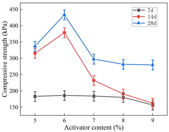 Figure 3 shows the compressive strength variations in the fly-ash-based geopolymer-stabilized soils with alkali activator content (modulus of 1.0 and a slag content of 30%). As can be seen from Figure 3, the UCS of the stabilized soil did not always increase with increasing alkali activator content, and it reached the highest value when the alkali activator content was 6%, after which the strength of the geopolymer-stabilized soil decreased with increasing alkali activator content. The increased OH− in the system led to excessive early deposition of the silicate products, which hindered the later reaction of the Si and Al [30]. However, when the activator content was too high, the excessive amount of alkali metal ions M+ affected the charge balance of the system, which was not conducive to the formation and development of the structure [31]. When the hydration reaction occurred for a certain amount of time, the reaction products could only cover the surface of the structure, which hindered the contact between the geopolymer and the soft soil, resulting in excessive alkaline activator residue, which was not conducive to the development of the overall structure of the solidified soil.
