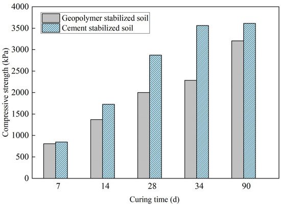 Under the same conditions, take 20% geopolymer- and cement-stabilized soft soil, respectively. The cement is P.O. 42.5 ordinary Portland cement with a water–cement ratio of 0.5. The mix ratio of geopolymer stabilized soil is the best mix ratio of the above orthogonal test. A comparative analysis of the effect of geopolymer and cement in strengthening soft soil was conducted. Figure 4 is a comparison chart of the compressive strength of cement-soil test block and geopolymer-soil test block at different ages. It can be seen that the unconfined compressive strength of cement-soil and geopolymer soil increases with the increase of curing time. Under the same conditions, the compressive strength of cement-stabilized soft soil is higher than that of fly-ash-slag based geopolymer stabilized soft soil. From 0 to 28 days, the compressive strength of cement-soil increased rapidly, and its strength reached 2.87 MPa at 28 days. However, from 28 to 90 days, the growth rate of the compressive strength of cement-soil slowed down, which was lower than the growth rate of geopolymer-stabilized soil [32]. The geopolymer-stabilized soil reached 3.21 MPa at 90 d.