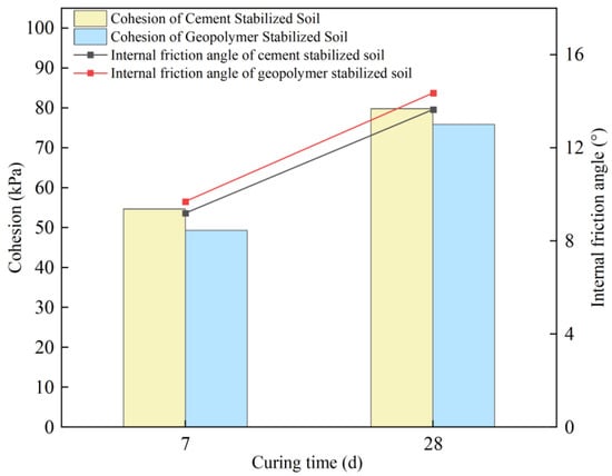 It can be seen from Figure 5 that the cohesion of the cement-stabilized soil is greater than that of the geopolymer-stabilized soil, and the internal friction angle of the cement-stabilized soil is smaller than that of the geopolymer-stabilized soil. It can be seen that both cement and geopolymer can significantly improve the compressive and shear strength of soft soil and can play a good role in improving the mechanical properties of soft soil. It can far meet the strength requirements of mixing piles in practical projects.