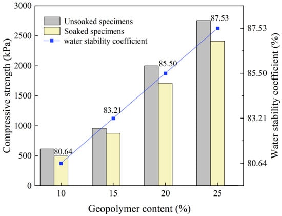 The UCS of the specimens before and after water immersion were the most direct indicator of the water stability of the geopolymer-stabilized soft soils. Figure 6 shows the UCS and water stability coefficients of the geopolymer-stabilized soft soils with geopolymer contents of 10%, 15%, 20%, and 25% under standard maintenance and continuous water immersion for 32 days. It can be seen that the water stability coefficients were all greater than 80%, which reflects the water stability of the geopolymer-reinforced soils. The comparison shows that the softening effect of the water immersion reduced the UCS of the geopolymer-stabilized soil. When the geopolymer content was higher, the loss rate of compressive strength was lower, and the water stability was higher. This is because the more geopolymer was incorporated, the more gel material was generated by the action of the geopolymer, which increased the bonding effect and strengthened the overall structure of the stabilized soil, thus increasing its ability to resist the weakening effect of the water immersion.