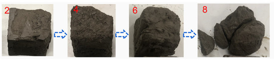 Figure 7 shows the change in the appearance of the geopolymer-stabilized silty soft soil with a geopolymer content of 10% under different numbers of wet–dry cycles. For the specimen with a 10% geopolymer content, there was obvious peeling of the outer skin on the surface of the specimen after one wet–dry cycle, serious damage after two to four cycles, and almost all of the outer layer of the specimen peeled off after the fourth cycle. The specimen exhibited local collapse and cracks at the end of the sixth cycle. The specimens with a 15% geopolymer content started to develop minor cracks and small pieces peeled off after the fourth wet–dry cycle. In contrast, for the specimens with geopolymer contents of 20% and 25%, the surfaces were almost completely intact after six wet–dry cycles. The above phenomenon demonstrates that a proper increase in the geopolymer content of stabilized soil will provide better resistance to damage caused by wet–dry cycles.