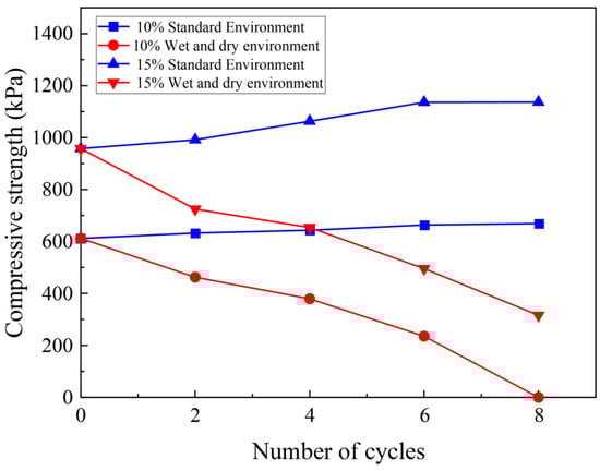 Variations in the compressive strengths of the samples with curing agent contents of 10% and 15% with an increasing number of wet–dry cycles.