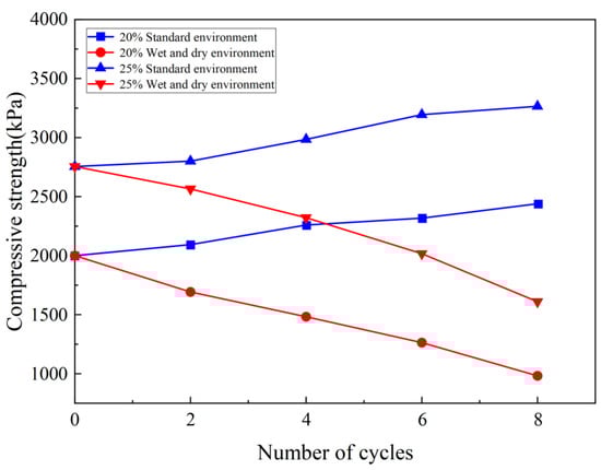 Variations in the compressive strengths of the samples with curing agent contents of 20% and 25% with an increasing number of wet–dry cycles.