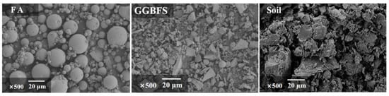 SEM images of the FA, slag (GGBFS), and undisturbed soft soil.