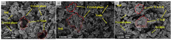Figure 12a,b present the SEM images of the geopolymer soil specimens with activator moduli of 0.8 and 1.0, respectively. The geopolymer soil specimen with a modulus of 0.8 is more dense and less porous than that with a modulus of 1.0, and the surfaces of the soil particles are covered with more white colloidal material. A large amount of white colloidal hydration products can be seen in Figure 12a, which indicates that a modulus of 0.8 provides a suitable alkaline environment for the geopolymer reaction to occur to a more adequate extent, producing more colloidal products that effectively fill the spaces between the soil particles. Figure 12a,c present the SEM images of the geopolymer soil specimens with slag contents of 30% and 50%, respectively. More unreacted slag particles can be seen in Figure 12c, which shows that the geopolymer-stabilized soil particles become more closely connected and the pore space gradually decreases with increasing slag content [15]. This is due to the fact that the slag provides more Ca2+ to participate in the geopolymerization reaction, which generates more C-S-H and N-A-S-H, while the exotherm of the slag in the hydration reaction promotes the geopolymerization reaction [22,34].