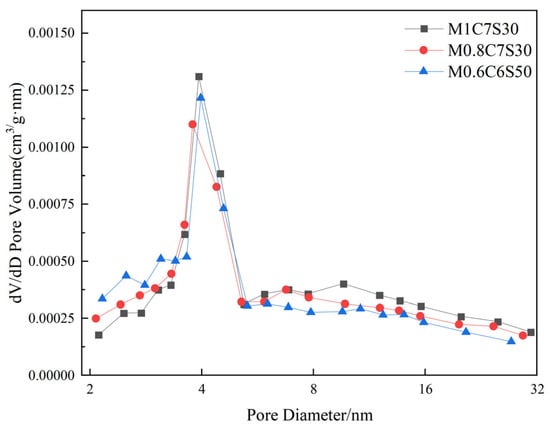 MxCySz is used to represent activator modulus = x, alkali content = y%, slag content = z%. Figure 13 shows the pore diameter distribution of geopolymer-stabilized soft soils with different mix ratios. At the pore diameter 4–5 nm, the pore volume is the largest, indicating that the internal pore diameter of the sample is mainly 4–5 nm. The samples of the activator modulus of 0.8 and 1 were compared. It can be seen that the pore volume of the activator modulus of 0.8 is relatively large when the pore diameter is less than 4 nm; when the pore diameter is greater than 5 nm, the pore volume of the activator modulus of 1 is relatively large, which indicates that the sample of activator modulus of 0.8 contains more pores less than 4 nm and the structure is more compact. The pore volume of the small pores with the optimal component is the largest, the structure is stable, and the intensity is the highest. It is precisely because the geological polymer bonds the soil particles and improves the contact method between the soil particles as well as filling the pores between the soil particles, reducing the internal pores and thereby making the soil structure firm [23].