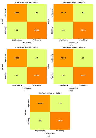 Figure 3 illustrates the confusion matrices produced by the ODAE-WPDC model under distinct folds. On fold-1, the ODAE-WPDC model recognizes 4816 samples under the legitimate class and 6066 samples under the phishing class. On fold-3, the ODAE-WPDC approach recognizes 4839 samples under the legitimate class and 6128 samples under the phishing class. Additionally, on fold-4, the ODAE-WPDC system recognizes 4833 samples under the legitimate class and 6131 samples under the phishing class. At last, on fold-5, the ODAE-WPDC methodology recognizes 4846 samples under the legitimate class and 6129 samples under the phishing class.