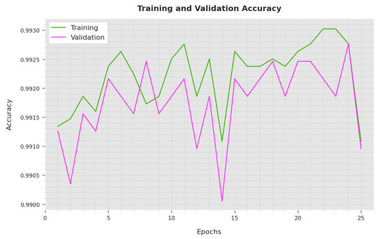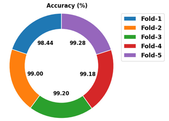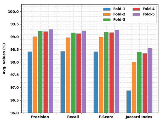 Table 2 and Figure 4 illustrate a brief classification result of the ODAE-WPDC approach under varying folds. The experimental outcomes indicate that the ODAE-WPDC model has resulted in maximum performance under all folds. For sample, with fold-1, the ODAE-WPDC model offers an average of 98.44%, of 98.41%, of 98.42%, of 98.41%, and of 96.88%. Simultaneously, with fold-2, the ODAE-WPDC approach has an accessible average of 99%, of 99.01%, of 98.97%, of 98.99%, and of 98%. Concurrently, with fold-3, the ODAE-WPDC method has an obtainable average of 99.20%, of 99.23%, of 99.16%, of 99.19%, and of 98.40%. Along with that, with fold-4, the ODAE-WPDC system presents an average of 99.18%, of 99.21%, of 99.13%, of 99.17%, and of 98.34%. At last, with fold-5, the ODAE-WPDC approach has an obtainable average of 99.28%, of 99.29%, of 99.24%,