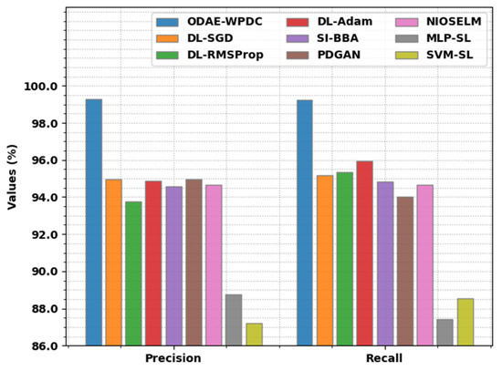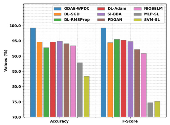 Figure 8 illustrates a comparative and inspection of the ODAE-WPDC system with recent models. The figure implies that the ODAE-WPDC approach has resulted in enhanced performance in terms of and . With regard to , the ODAE-WPDC system has obtained improved of 99.29%, whereas the DL-SGD, DL-RMSProp, DL-Adam, SI-BBA, PDGAN, and NIOSELM models have gained of 94.97%, 93.77%, 94.87%, 94.59%, 94.96%, and 94.65%, respectively. In addition, in terms of , the ODAE-WPDC model has obtained higher of 99.24% whereas the DL-SGD, DL-RMSProp, DL-Adam, SI-BBA, PDGAN, and NIOSELM methods have achieved of 95.17%, 95.34%, 95.93%, 94.84%, 94.02%, and 94.66%, correspondingly.