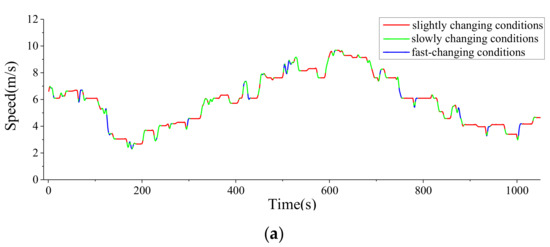 In the driving intention classification, 20 groups of vehicle operation data, totaling 20,238 sample points, were randomly selected for testing. The average recognition accuracy of vertical driving intention is 94.83%, and the average recognition accuracy of horizontal driving intention is 93.25%, which has a good recognition effect on driving intention. Figure 2 shows the driving intention classification results from one set of vehicle data, with different colors representing different driving intentions in the horizontal and vertical directions.