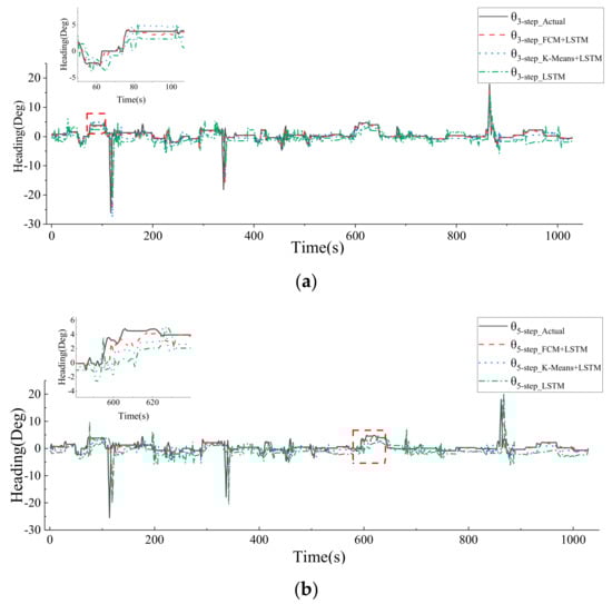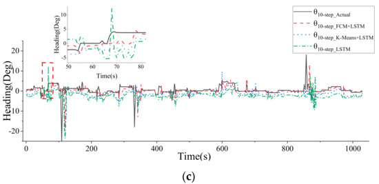 Comparison of multistep heading angle prediction results: (a) comparison of the results of 3-step heading angle prediction; (b) comparison of the results of 5-step heading angle prediction; (c) comparison of the results of 10-step heading angle prediction.