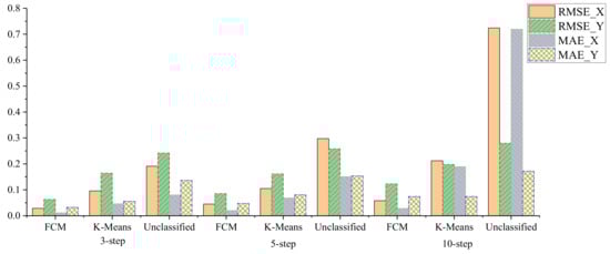 As shown in Figure 5, the comparison of RMSE and MAE of prediction in horizontal and vertical coordinates in the third step, fifth step, and tenth step using different prediction methods. Firstly, the three methods’ RMSE and MAE increased with the prediction step’s increase, especially in the tenth step. The RMSE and MAE values of the prediction algorithm without driving intent classification increased significantly in the horizontal coordinate compared to the fifth step, which proved that the prediction algorithm without driving intent classification was less effective at longer steps. Second, the RMSE and MAE values of the algorithm in this paper, both lower than the other two algorithms, prove the effectiveness of this algorithm.