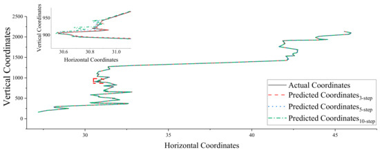 Finally, the algorithm was verified using real vehicle data, and the results showed that none of the horizontal prediction errors of the future 1s trajectory prediction results were greater than 0.013 m. All prediction results’ maximum values of horizontal distance prediction error reached 0.56 m. The vertical prediction error was no more than 0.025 m, and the maximum prediction error of the vertical distance among all the prediction results reached 0.63 m.