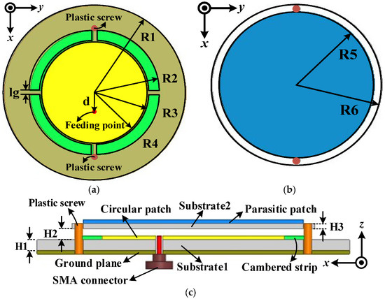 Geometry of the proposed patch antenna: (a) top view of Substrate 1; (b) top view of Substrate 2; (c) side view of the proposed antenna. R1 = 48, R2 = 32, R3 = 27, R4 = 26.25, R5 = 33, R6 = 38, d = 9.8, lg = 4, H1 = 1.5, H2 = 0.5, H3 = 1.1 (all dimensions in mm).