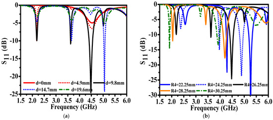 In order to clearly explain the working mechanism of the designed antenna for multi-frequency, widened bandwidth, and diverse radiation patterns, the three antennas that appear in sequence during the antenna design process are shown in Figure 2. Ant. 1 is a traditional single-layer circular patch antenna with an off-center probe. Compared with the center-fed circular patch antenna in [1,2,6], the off-center feeding proposed in this paper introduces more resonance modes. As for Ant. 1, the distance between the feeding point and the center of the circular patch is set to d, and the radius of the circular patch is set to R4. In terms of the reflection coefficient, a detailed parameter analysis is carried out for these two parameters, and the corresponding simulated results are shown in Figure 3. It can be observed from Figure 3a that when d = 0—that is, when the center-fed probe is employed—the antenna has only one resonance point at 4.53 GHz. As d gradually increases, Ant. 1 exhibits the characteristics of multi-frequency resonance. In detail, when d = 9.8 mm, Ant. 1 exhibits a reflection coefficient of less than −10 dB at 2.18 GHz, 3.62 GHz, and 4.48 GHz, respectively. On the basis that d is determined to be 9.8 mm, we further study the influence of R4 on antenna resonance. It can be seen from Figure 3b that, as the size of the circular patch continues to increase, the three resonant frequency points of Ant. 1 all move to lower frequencies. Based on the above discussion, it can be concluded that, for Ant. 1, the position of the feeding point determines the resonance mode of the antenna, and the position of the resonance frequency point is mainly influenced by the size of the circular patch.