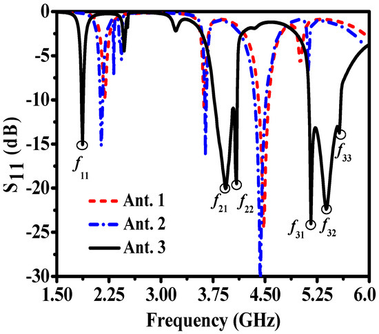 Since the optimal reflection coefficients of Ant. 1 at the frequency points of 2.18 GHz and 3.62 GHz are greater than −10.56 dB, which fails to meet the requirements of engineering applications, some improvements are implemented in Ant. 1. As shown in Figure 2a, four cambered strips surrounding the outside of the circular patch are introduced to form Ant. 2, and the simulated result of S11 is given in Figure 4. It is worth mentioning that metal cambered strips surrounding the circular patch are introduced to improve impedance matching. The specific performance is the gap between the four cambered strips; the gap between the strips and the circular patch is both capacitive and employed to reduce the inductance introduced by the coaxial probe. Compared with the simulated result of Ant. 1, the improved Ant. 2 also has three resonance modes, which are the same as Ant. 1. The specific performance of the reflection coefficient amplitudes of Ant. 2 at the three frequency points of 2.14 GHz, 3.64 GHz, and 4.43 GHz are −15.18 dB, −16.34 dB, and −32.08 dB, respectively, all of which satisfy the requirement of less than −15 dB. On the basis of Ant. 2, Substrate 2, printed with a parasitic patch, is placed directly above Ant. 2, and an air layer with thickness of 0.5 mm is introduced between the two substrates to form Ant. 3. Attributed to the coupling effect between the circular patch and the parasitic patch, the surface current distribution on the circular patch changes, and the simulated results of S11 are given in Figure 4. The simulated results show that the reflection coefficients of Ant. 3 in the three frequency bands of 1.86–1.89 GHz, 3.77–4.09 GHz, and 5.14–5.59 GHz are all lower than −10 dB. According to the location of the frequency band, three resonant frequency bands of Ant. 3 are named f1, f2, and f3 (from low to high). Compared with the previous two antennas, Ant. 3 achieves the characteristics of extended bandwidth while maintaining three resonance modes.