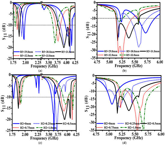 The effect of different parameters on simulated S11 of Ant. 3: (a) the effect of different R5 on frequency bands f1 and f2; (b) the effect of different R5 on frequency band f3; (c) the effect of different H2 on frequency bands f1 and f2; (d) the effect of different H2 on frequency band f3.
