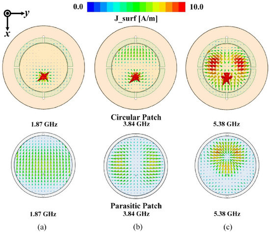 The simulated surface current distribution on the circular patch and parasitic patch of Ant. 3: (a) 1.87 GHz; (b) 3.84 GHz; (c) 5.38 GHz.