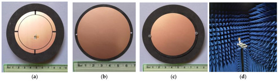 Photography of the fabricated patch antenna: (a) top view of Substrate 1; (b) top view of Substrate 2; (c) top view of the assembled antenna; (d) test process of the fabricated antenna.
