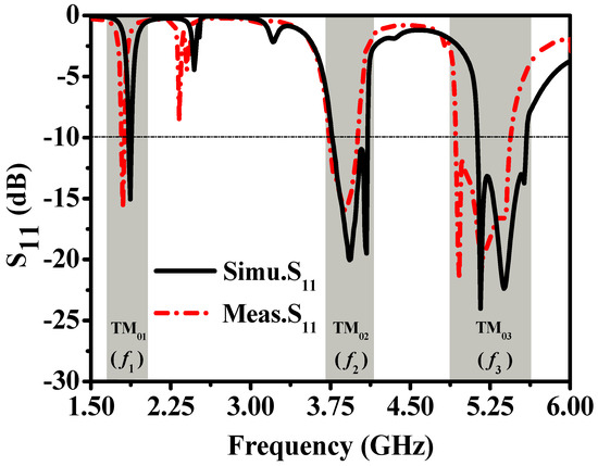 Regarding the reflection coefficient of the proposed tri-band patch antenna, the comparison curve between the simulated result and the measured result is depicted in Figure 9. The measured S11 shows that the fabricated antenna operates in three frequency bands of f1: 1.79–1.81 GHz, f2: 3.74–4.0 GHz, and f3: 4.93–5.44 GHz. Compared with the simulated results, both f1 and f3 show signs of moving towards a lower frequency, which is mainly due to errors introduced during the assembly and testing.