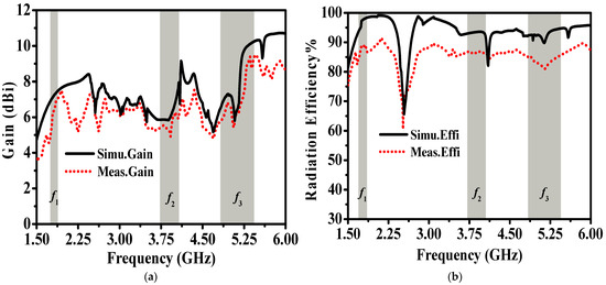 Meanwhile, Figure 10 shows the measured results of antenna gain and radiation efficiency. As shown in Figure 10a, the measured maximum gains of the antenna in f1, f2, and f3 are, respectively, 6.35 dBi, 6.15 dBi, and 9.42 dBi, which are lower than the simulated gains of 7.20 dBi, 6.74 dBi, and 10.62 dBi. In terms of radiation efficiency, Figure 10 presents the compared results of measurement and simulation. The results show that the measured efficiencies in the three frequency bands are 89.2%, 86.9%, and 85.6%, respectively, and are lower than the simulated results of 98.0%, 93.6%, and 94.7%. The measured antenna gain and radiation efficiency both show partial attenuation, which is mainly due to the loss introduced by the 0.5 mm foam layer and the error in the welding and assembly process.