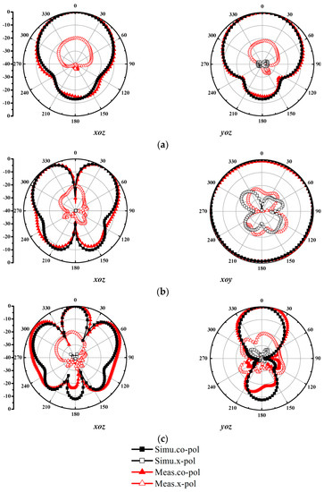 In order to visually reveal the pattern diversity of the designed antenna, Figure 11 shows the measured results of the radiation pattern at 1.80 GHz, 3.80 GHz, and 5.35 GHz. As shown in Figure 11a, the patterns which show broadside directional radiation on the xoz and yoz planes are obtained at 1.80 GHz, while an omnidirectional radiation pattern is achieved on the xoy plane at 3.80 GHz. Figure 11c shows the antenna pattern at 5.80 GHz with the characteristics of three adjacent beams on the xoz plane, which is caused by the introduction of higher-order modes. Based on the above analysis, the proposed Ant. 3 can be utilized for multi-service applications in wireless communication due to the characteristics of multi-mode operation, pattern diversity, and expanded bandwidth.