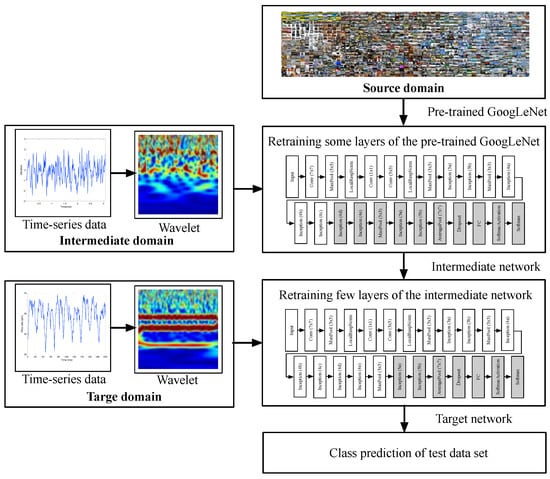 This section proposes a wavelet-based deep TL method to address the fault diagnosis problem using limited target samples. Figure 1 presents the proposed framework consisting of the pre-trained GoogLeNet, which uses the source data, and the partial retraining of the same pre-trained model, which uses the intermediate data and the target data. The continuous wavelet transform (CWT) constructs the time and frequency characteristics of the time-series signal and generates the image of the intermediate and target data.